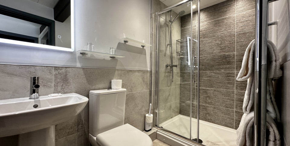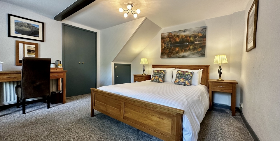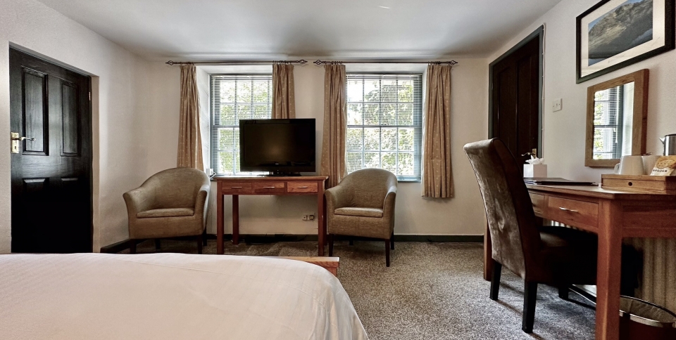 A double room on the ground floor of the former coach-house, in the hotel grounds. As with all our rooms, there is plenty of private parking as well. There is a brand new en-suite shower room. With its own external entrance, this bedroom is ideal for dog owners. This room can be combined with the Heron single room to create a private suite.